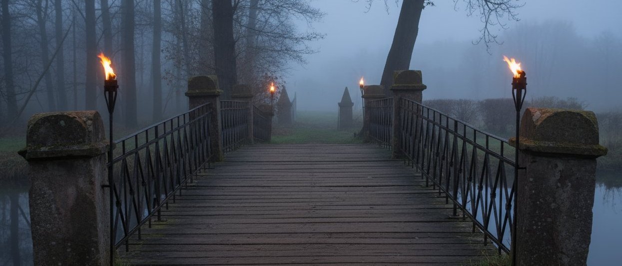 Der Fremde ritt jetzt über die Brücke. Sein Pferd scheute und tänzelte, als es mit den Hufen auf die vibrierenden, hölzernen Bohlen trat. Der dunkle Reiter riss an den Zügeln und gab ihm die Sporen, bis das schwarze Tier mit drei mächtigen Sätzen das Gras diesseits des Teiches erreichte.