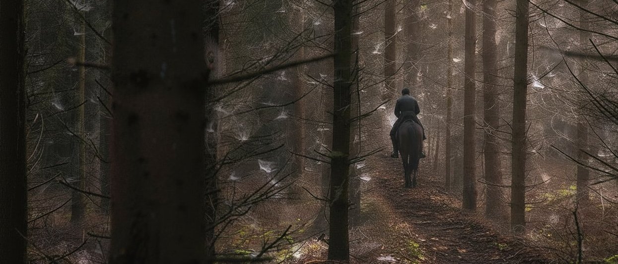 Das Pferd wusste – im Gegensatz zu seinem Reiter – ganz genau, wie nah das Ende des Waldes war. Und da wollte es hin, und zwar so schnell wie möglich. Als es zwischen den letzten rauen Stämmen hervorbrach und auf einem quer verlaufenden, ausgefahrenen Karrenweg ankam, stieg es unvermittelt, um nicht in den Straßengraben zu stürzen.